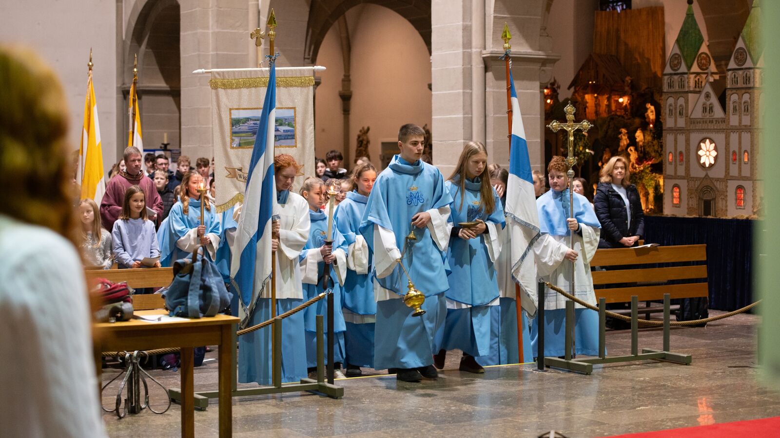 Zahlreiche Schülerinnen und Schüler wirkten aktiv am Gottesdienst mit – als Ministrantinnen und Ministranten, Lektorinnen und Lektoren sowie als Akteure eines Anspiels. Passend zum marianischen Schwerpunkt der Liturgie trugen die Ministrantinnen und Ministranten Gewänder in Marienblau.