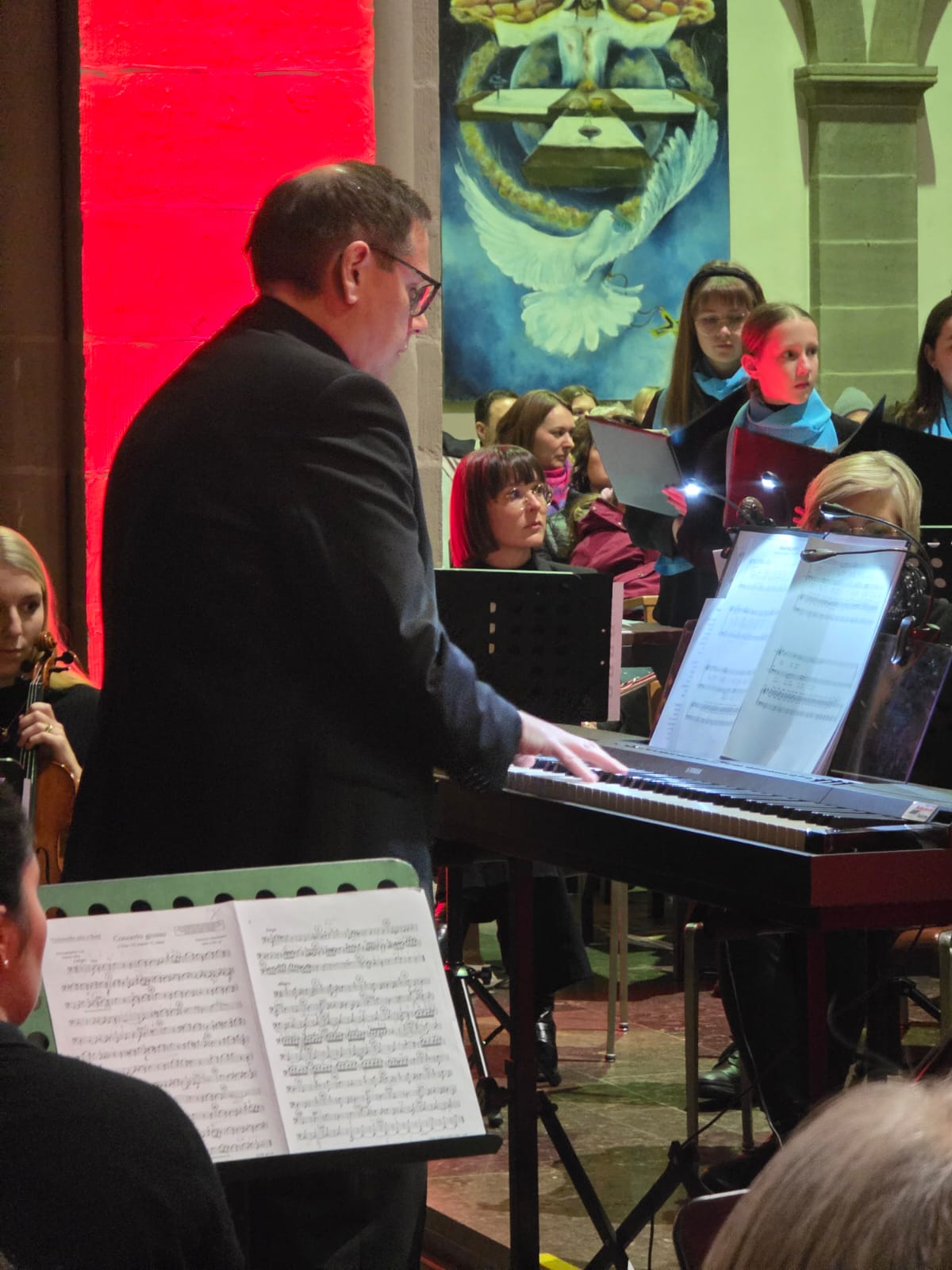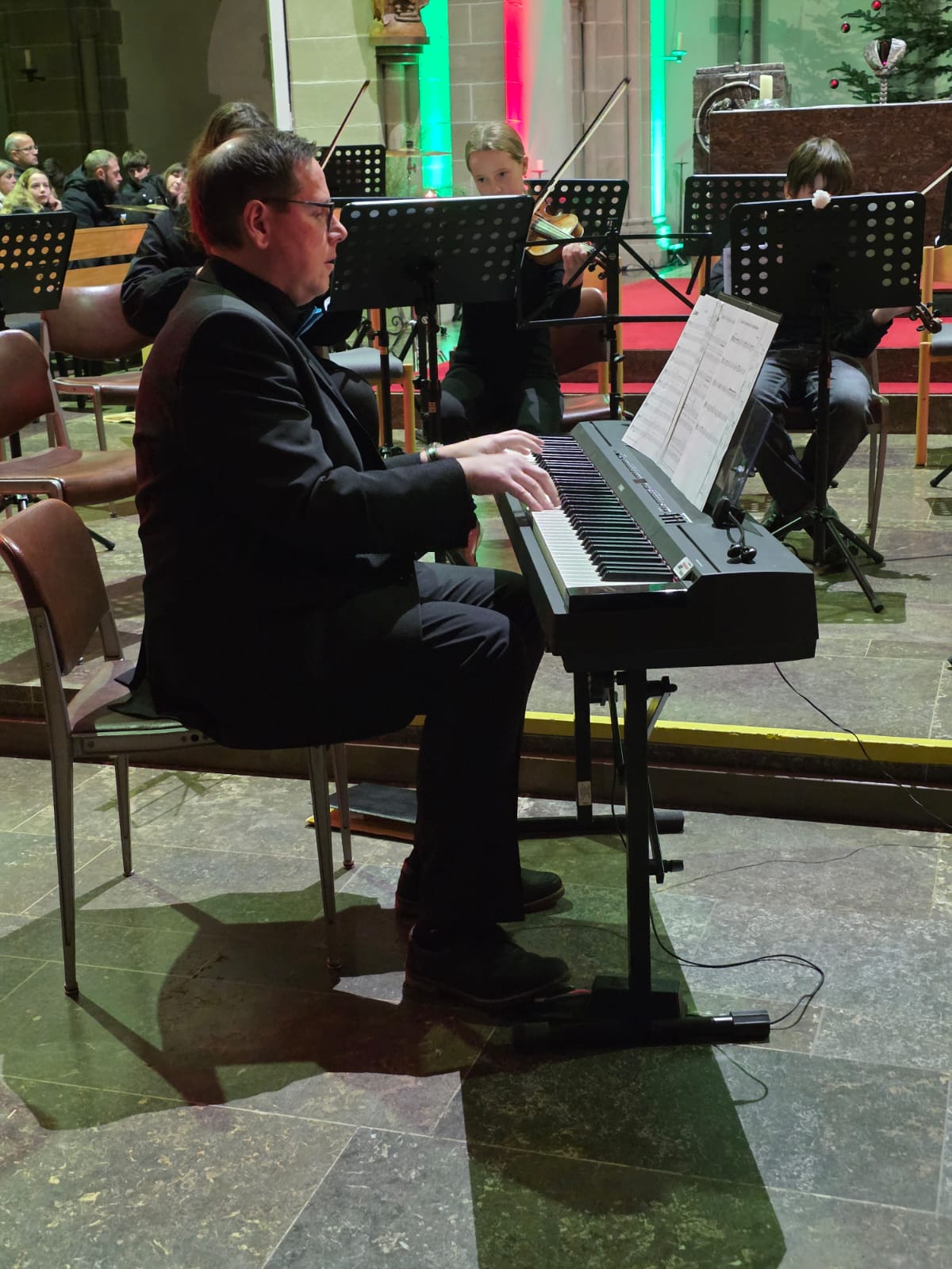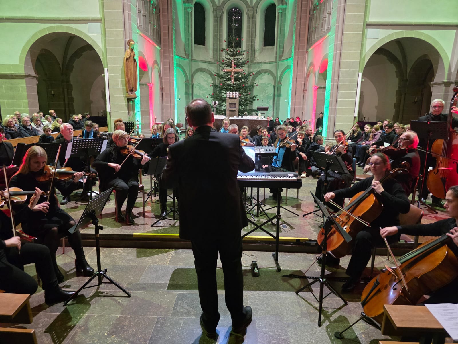 Auch das Kammerorchester Hünfeld, ebenfalls unter der Leitung von Thomas Nüdling, nahm als Akteur am Konzert teil. Die ca. 25 Streicher und Bläser stellten mit großer Spielfreude das barocke Weihnachtskonzert von Francesco Manfredini in drei Sätzen vor. In den Randsätzen zeigten die beiden Flöten wunderschönes Konzertieren mit den Streichern. Im „Tango de Nochebuena“ von Angel Villoldo wurde schließlich „Stille Nacht“ im Stil eines südamerikanischen Tangos vom Dirigenten rhythmisch präzise angeleitet und vom Orchester gekonnt interpretiert.