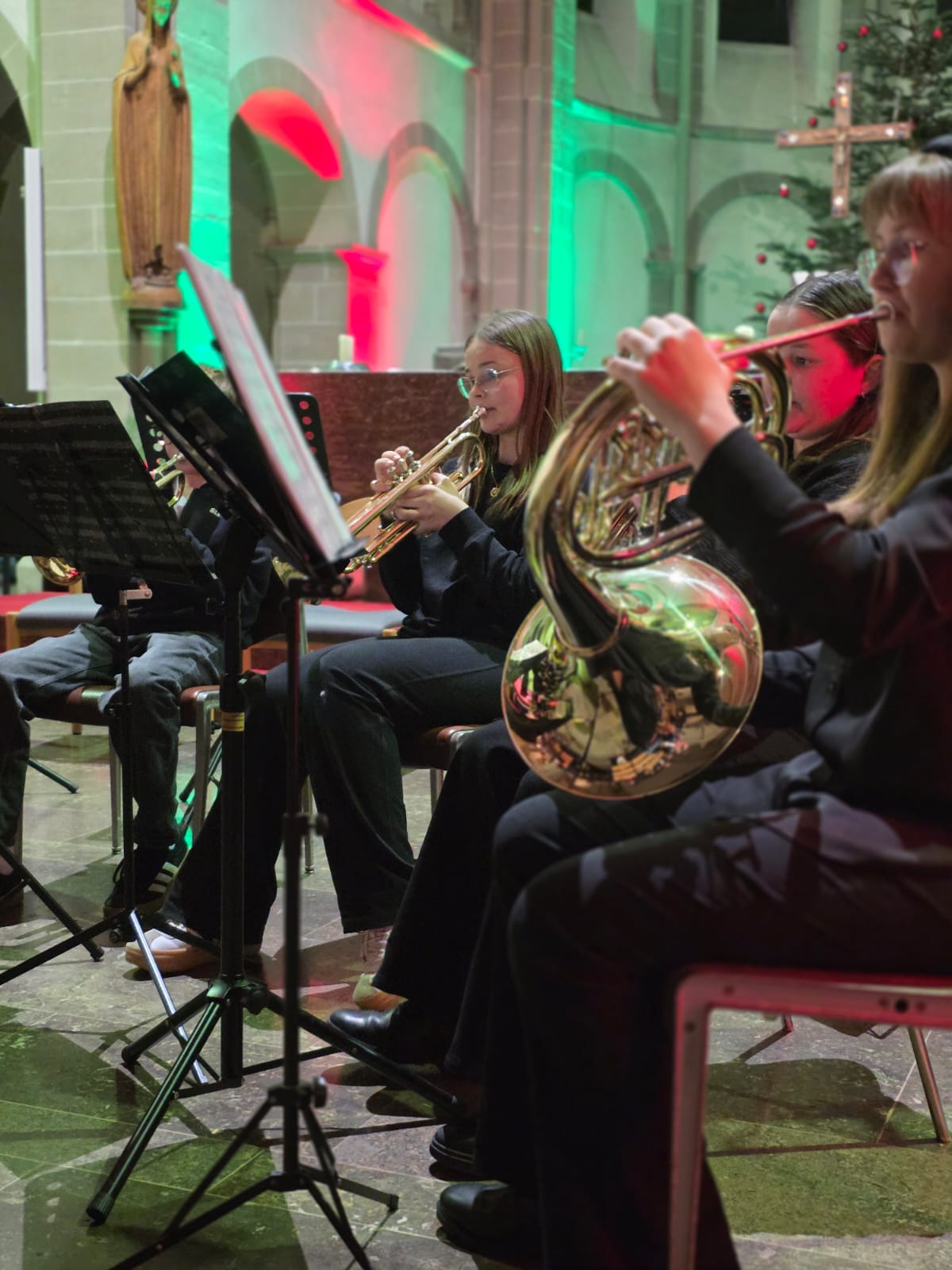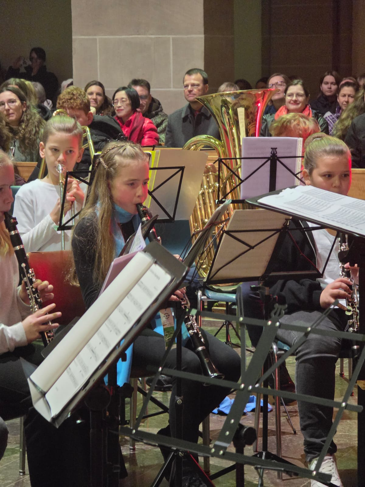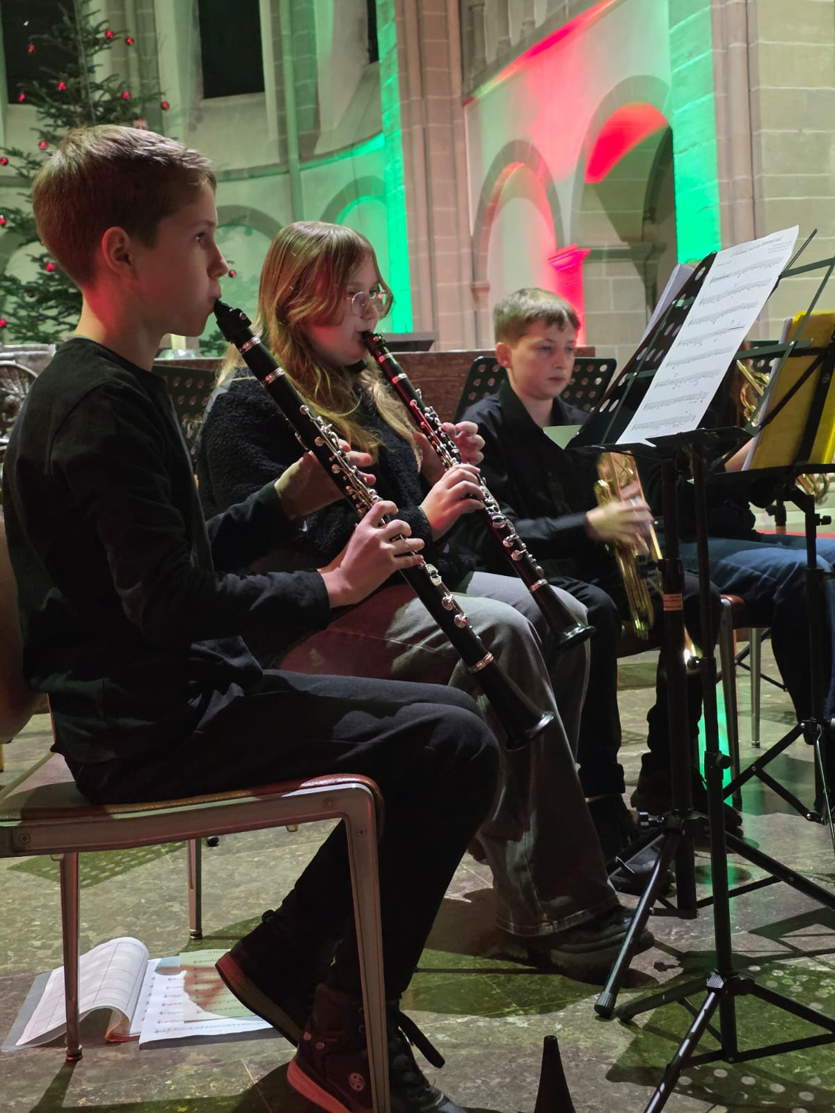 Nach der Begrüßung durch die Schulleiterin der Wigbertschule, Sandra Möllers, konnte die Bläserklasse der Jahrgangsstufe 5 unter Leitung von Martin Genßler bei ihrem ersten öffentlichen Auftritt „Ihr Kinderlein kommet“ und „Kling Glöckchen Klingelingeling“ ordentlich zu Gehör bringen, obwohl die Fünftklässlerinnen und Fünftklässler erst seit vier Monaten überhaupt ihre Instrumente lernen. Auch die Mädchen und Jungen der Bläserklasse der Jahrgangsstufe 6 stellten sich mit „O Heiland, reiß die Himmel auf“ und „Fröhliche Weihnacht überall“ als souveräne Blasmusiker vor.