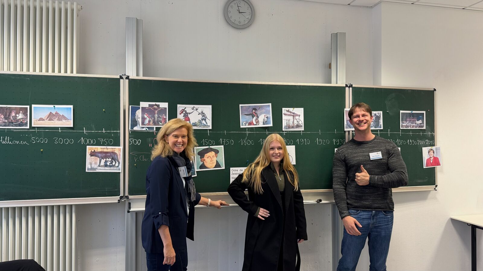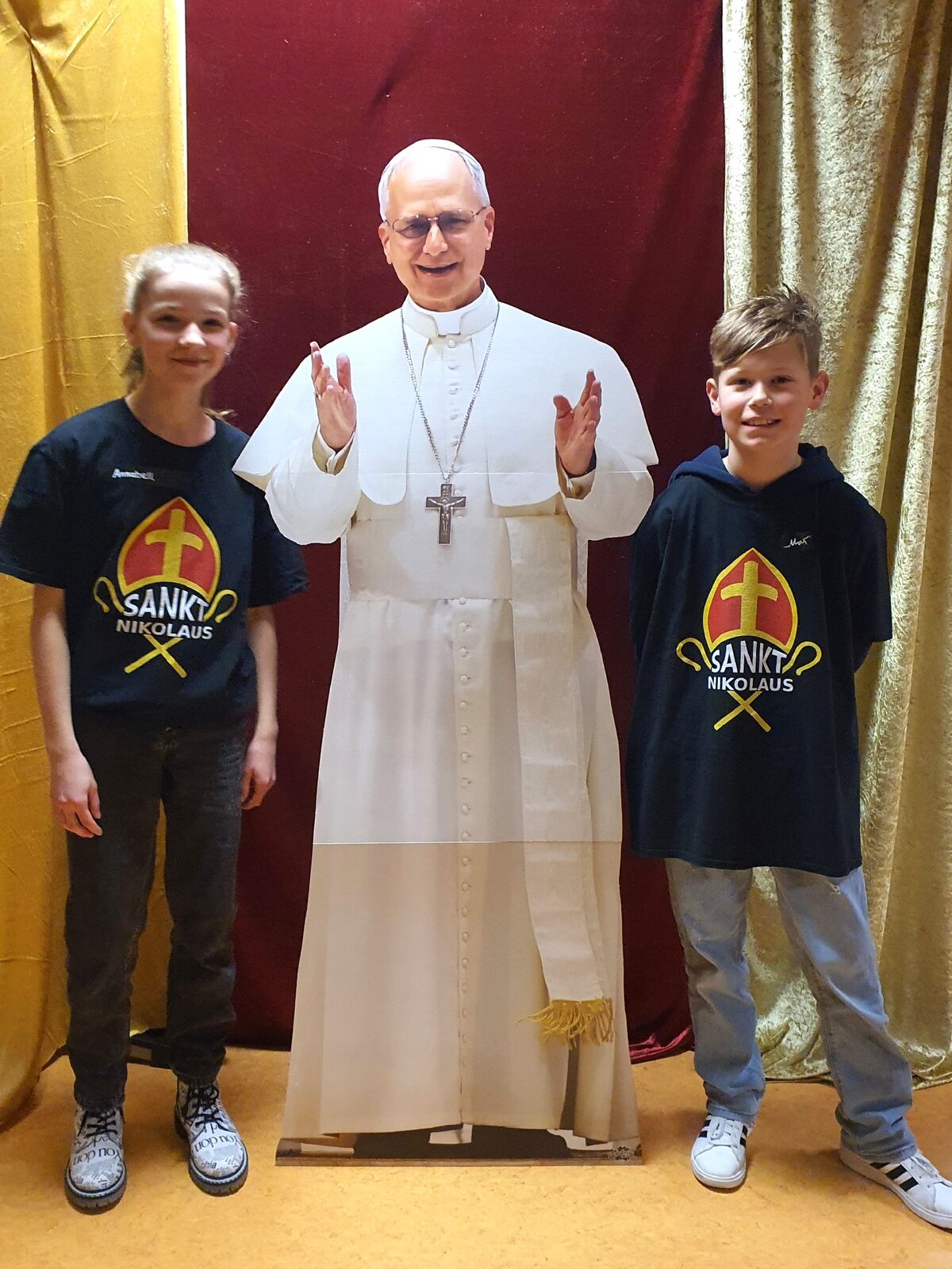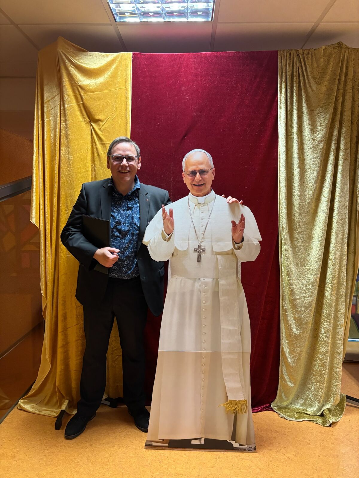 Auch die Sprachen, die Gesellschaftswissenschaften, Kunst, Darstellendes Spiel und die Mathematik boten den interessierten künftigen Schülerinnen und Schülern ein buntes Programm. So konnte man im Raum der „Katholischen Religion“ auch Bilder mit dem lebensgroßen Papst Leo XIV. machen. Natürlich waren auch die Eltern- und Schülervertretung sowie der Förderverein mit Ständen vertreten und informierten über ihre Arbeit.