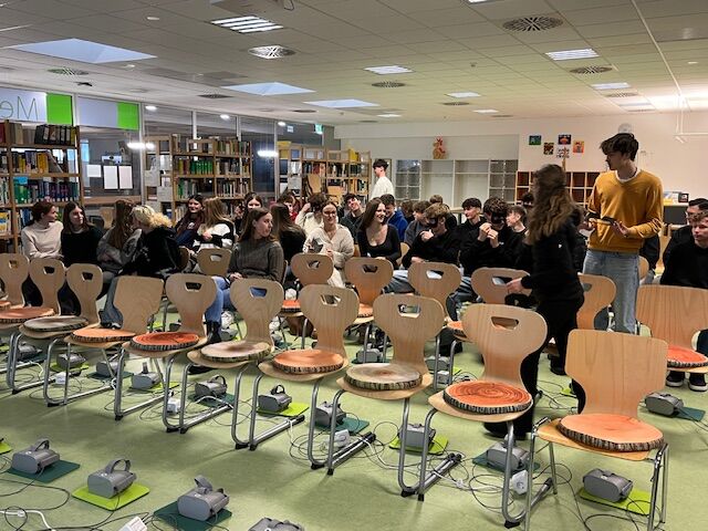 Das innovative Lernformat versprühte eine futuristische Atmosphäre in der Mediothek der Wigbertschule – völlig anders als der gewöhnliche Unterricht im Klassenraum. Ausgestattet mit VR-Brillen auf bequemen „Baumstammkissen“ begaben sich die Schülerinnen und Schüler auf fünf virtuelle Reisen zunächst durch den Weltraum, dann über Grönland, die Fidschi-Inseln, über Brandenburg und schließlich zurück zur Arktis.