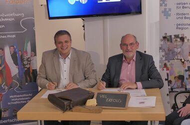 Schulleiter Markus Bente sowie Hans-Georg Ehrhardt-Gerst, Leiter der Hünfelder HZD-Außenstelle, unterzeichneten im Beisein von Ellen Bittorf, der Koordinatorin für das Duale Studium, die von beiden Seiten gewünschte Kooperationsvereinbarung.