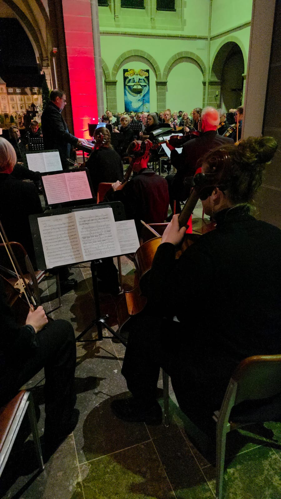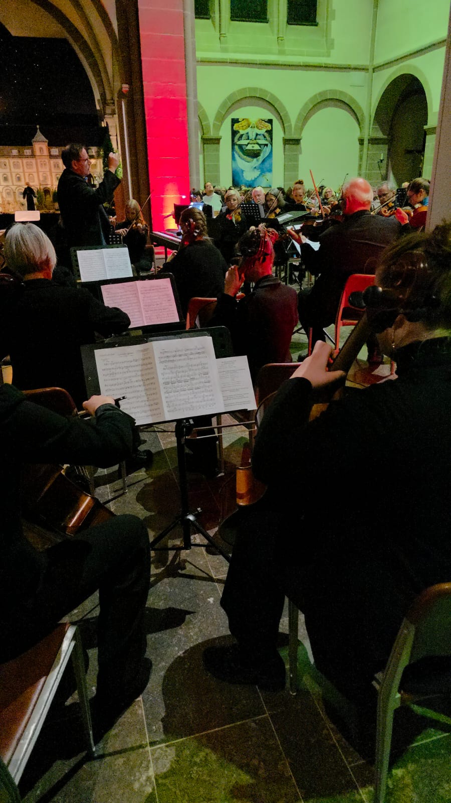 Auch das Kammerorchester Hünfeld, ebenfalls unter der Leitung von Thomas Nüdling, nahm als Akteur am Konzert teil. Die ca. 25 Streicher und Bläser stellten mit großer Spielfreude das barocke Weihnachtskonzert von Francesco Manfredini in drei Sätzen vor. In den Randsätzen zeigten die beiden Flöten wunderschönes Konzertieren mit den Streichern. Im „Tango de Nochebuena“ von Angel Villoldo wurde schließlich „Stille Nacht“ im Stil eines südamerikanischen Tangos vom Dirigenten rhythmisch präzise angeleitet und vom Orchester gekonnt interpretiert.