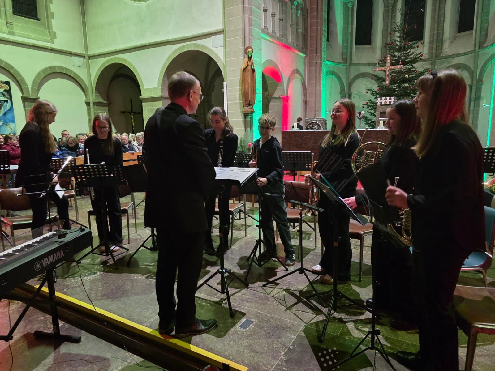 Nach der Begrüßung durch die Schulleiterin der Wigbertschule, Sandra Möllers, konnte die Bläserklasse der Jahrgangsstufe 5 unter Leitung von Martin Genßler bei ihrem ersten öffentlichen Auftritt „Ihr Kinderlein kommet“ und „Kling Glöckchen Klingelingeling“ ordentlich zu Gehör bringen, obwohl die Fünftklässlerinnen und Fünftklässler erst seit vier Monaten überhaupt ihre Instrumente lernen. Auch die Mädchen und Jungen der Bläserklasse der Jahrgangsstufe 6 stellten sich mit „O Heiland, reiß die Himmel auf“ und „Fröhliche Weihnacht überall“ als souveräne Blasmusiker vor.