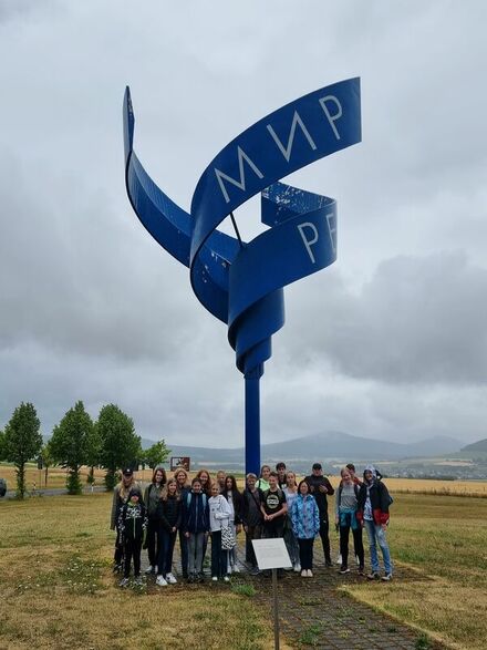 Mitte Juli führten die Geschichts-AG unter Leitung der Geschichtslehrerinnen Konstanze Lepel und Aline Gros gemeinsam mit der Klasse für ukrainische Schülerinnen und Schüler mit ihrer Klassenlehrerin Qian Neumann-Wang einen Projekttag auf Point Alpha durch. Frau Gros führte zunächst in ihrer Funktion als Gästebegleiterin fachkundig und schülergerecht in die Geschichte der deutsch-deutschen Teilung ein. Anschließend erläuterte sie anschaulich in der Ausstellung im „Haus auf der Grenze“ den Aufbau und die Auswirkungen der innerdeutschen Grenze. Durch die hervorragende und kompetente Übersetzung von Studienreferendarin Alexandra Keller konnten die ukrainischen Schülerinnen und Schüler stets mit eingebunden und somit die Sprachbarrieren gemeistert werden. Den Höhepunkt des Projekttages bildete das Fotoshooting auf dem Weg der Hoffnung. Die Schülerinnen und Schüler hatten sich bereits im Vorfeld mit den Gedanken, welche die 14 Skulpturen des Künstlers Dr. Ulrich Barnickel symbolisieren, beschäftigt. Interessant war es zu sehen, welche Assoziationen, Zitate und sogar selbstgeschriebene Gedichte sich die deutschen und ukrainischen Schülerinnen und Schüler zu den Stationen, etwa zu „Willkür“, „Entwürdigung“, „Gewalt“, „Trost“, „Hoffnung“ überlegt hatten. Die Fotoinszenierungen und Projektergebnisse werden auf dem Schulfest und Anfang des kommenden Schuljahres im Konrad-Zuse-Museum präsentiert werden.