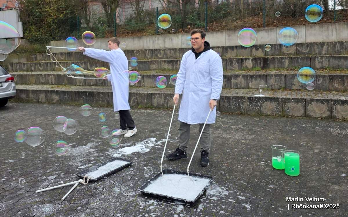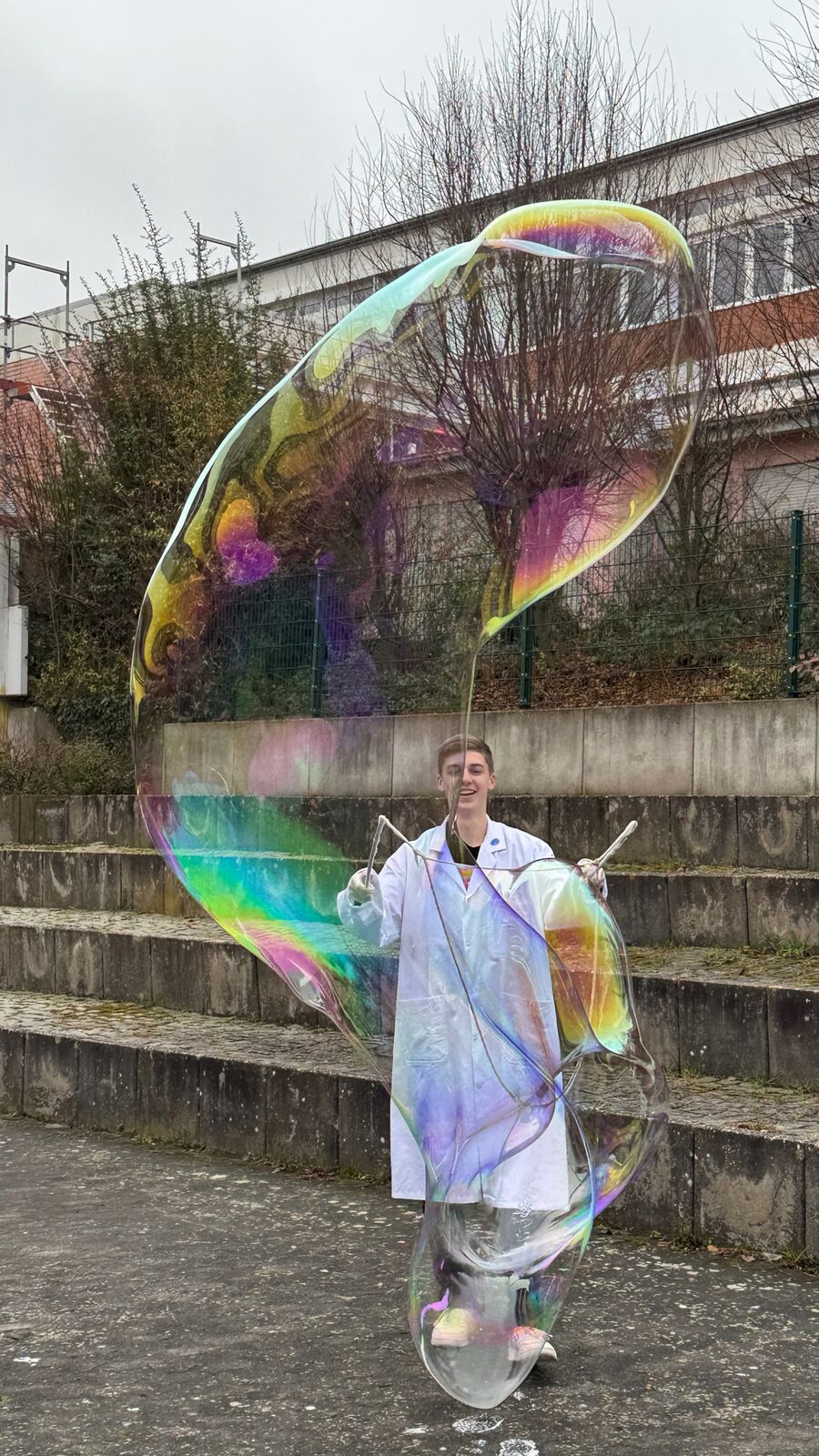 Bereits am Empfang wurden die Gäste freundlich und kompetent von Fachbereichsleitungen willkommen geheißen. Ein farbenfroher Blickfang waren am vorderen Schulhof die beeindruckenden Riesenseifenblasen, vorbereitet von der Klasse E1G1.